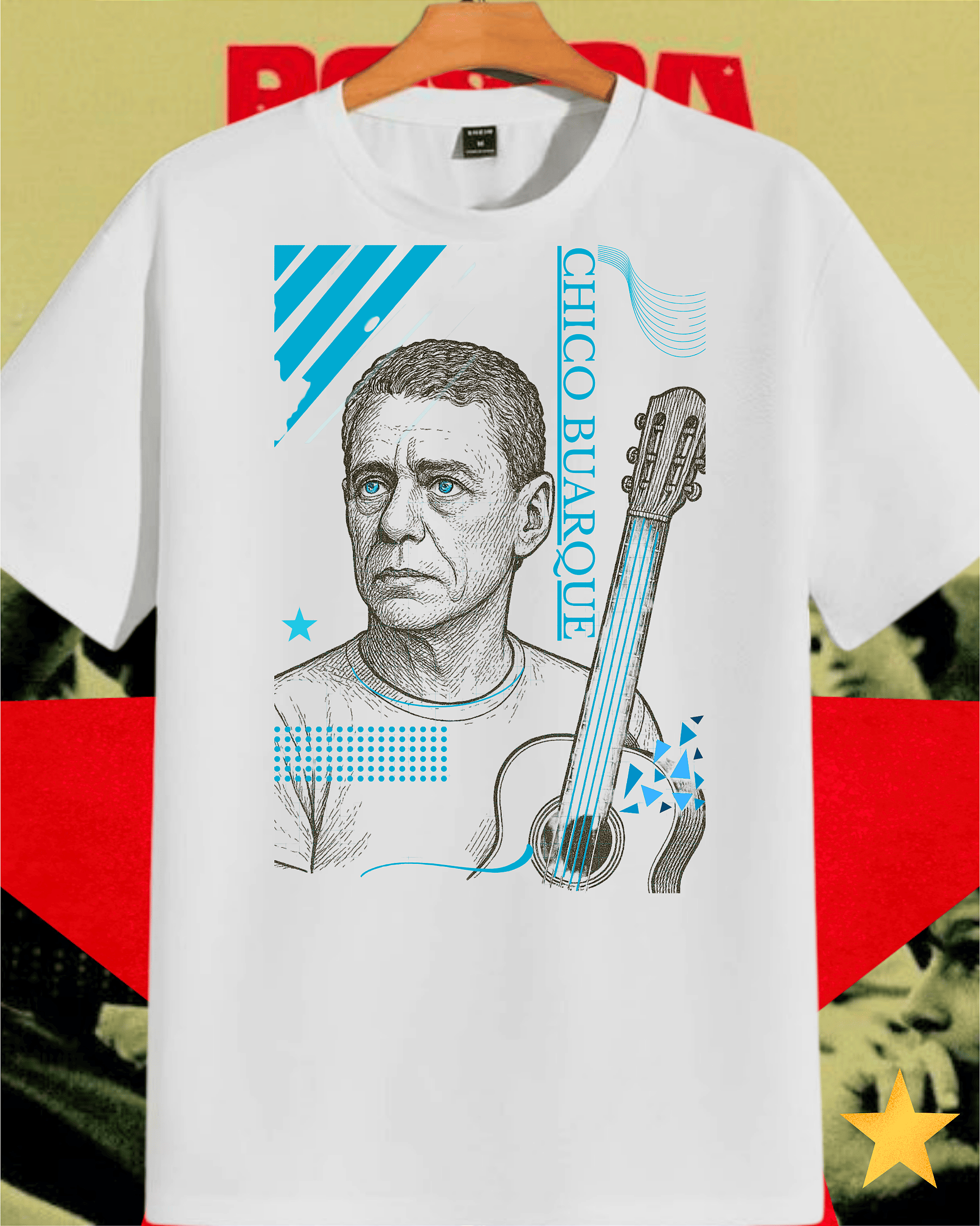 Um dos maiores nomes da música e da palavra, Chico atravessa o tempo com elegância, coragem e poesia. Nesta estampa com traço moderno e clássico, ele surge como ícone gráfico da luta, da canção e do pensamento crítico.